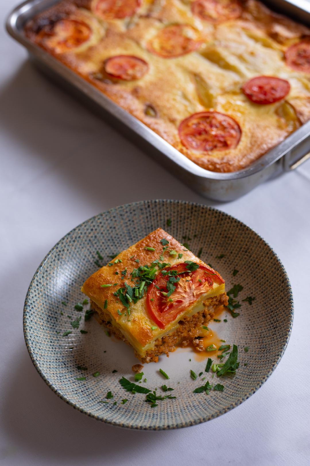 ingrediente:cartofi,carne tocata de porc,ceapa,bulion,foi de dafin,ulei,boia dulce,oua,sare,piper