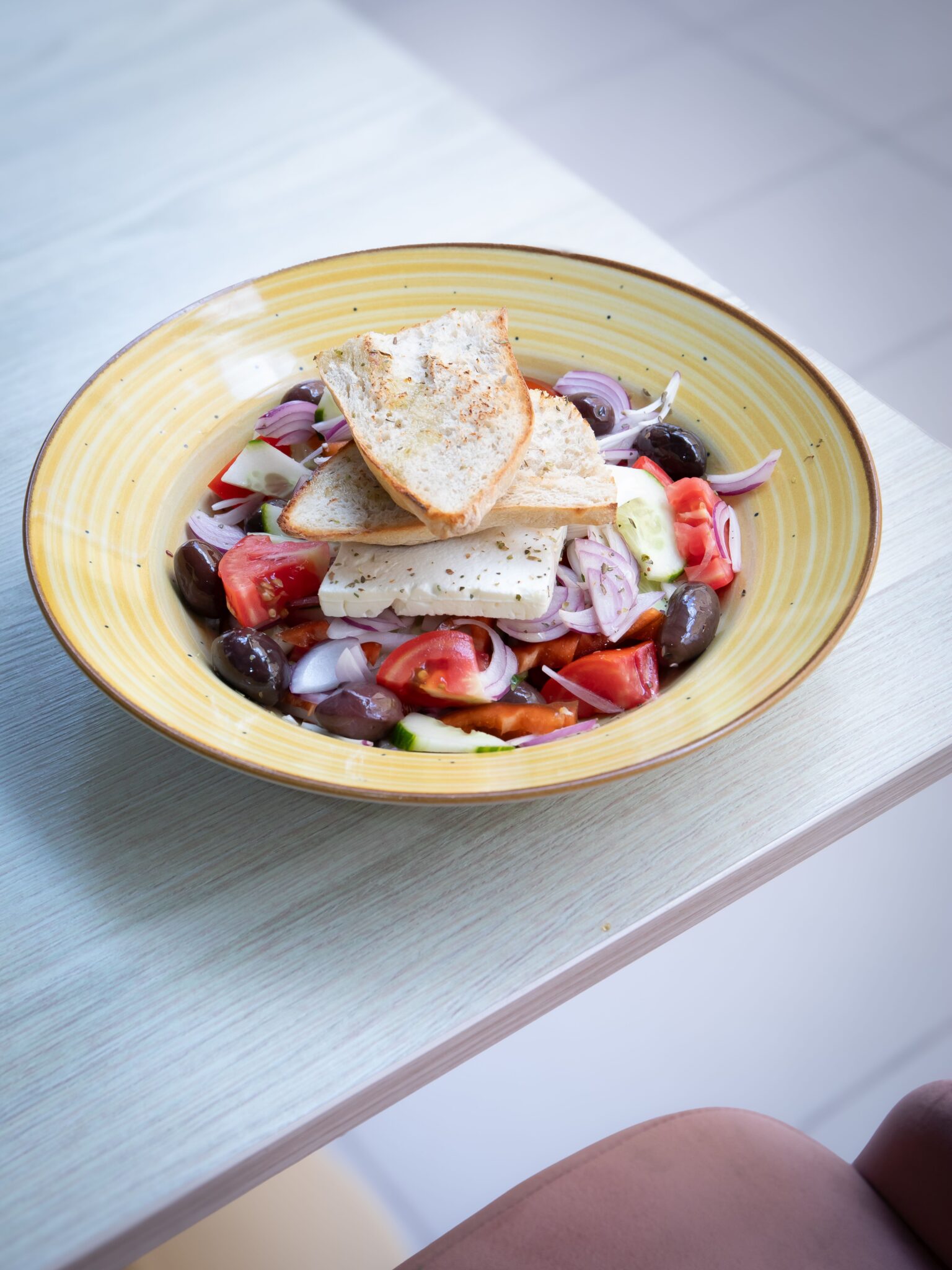 Ingrediente: rosii, castraveti, ceapa roșie, masline, branza feta, ulei măsline, organo, paine prajita Alergeni: gluten, lactoza